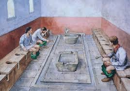 Roman cities often featured public latrines—multi-seat toilets built over channels of running water.